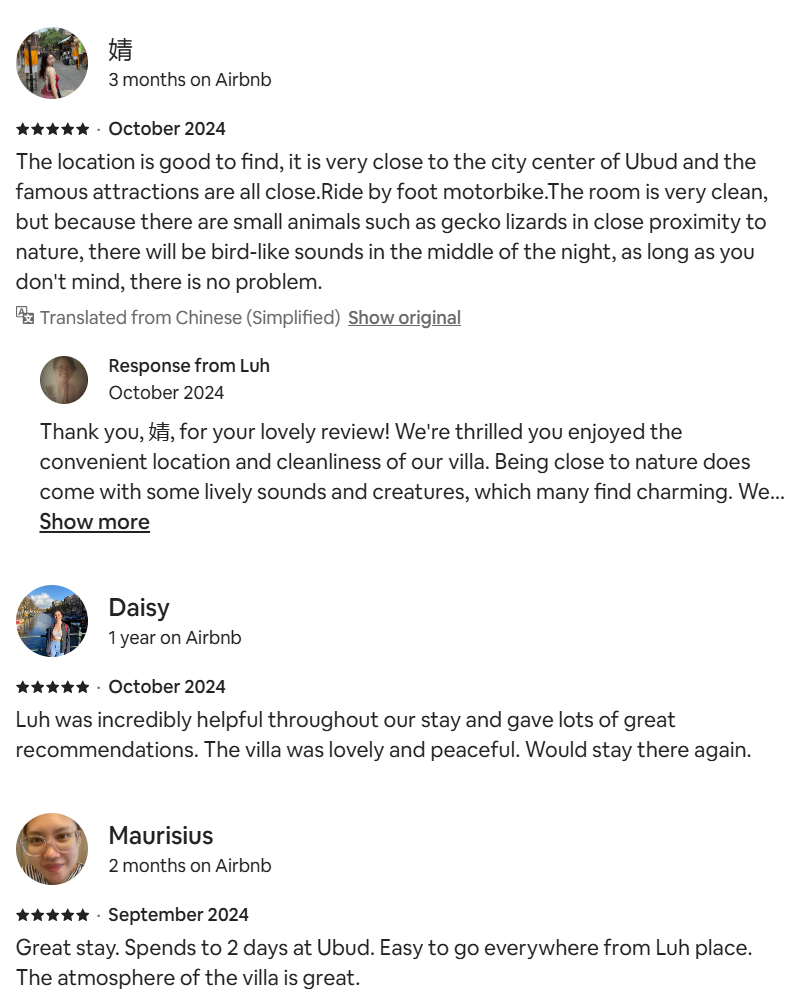 The villa is located in the local Balinese village and is surrounded by local households. Sometimes you can hear the sounds of the household animals that are nearby.