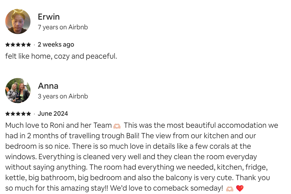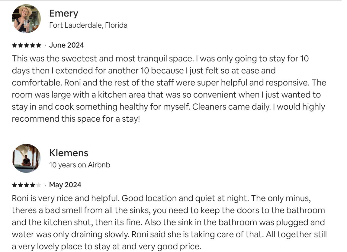 These are reviews that we copied from this property page. To read all the reviews go to the Airbnb page.
