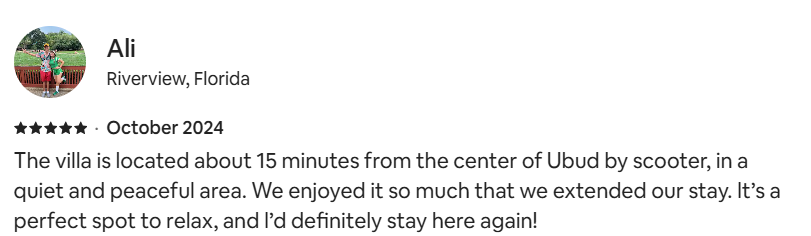Come and enjoy: two fully independent bedrooms (these are 2 houses, 15 meters from each other) connected by a nice small path, a huge parking area (enough for 10 cars) and a refreshing pool above the stream with a view of the jungle at the opposite side. Located at the most end of the quiet alley, this villa will be a justified choice for two young couples or a family of four who are eager to explore the Ubud area and Central Bali. The unique layout and a great location.