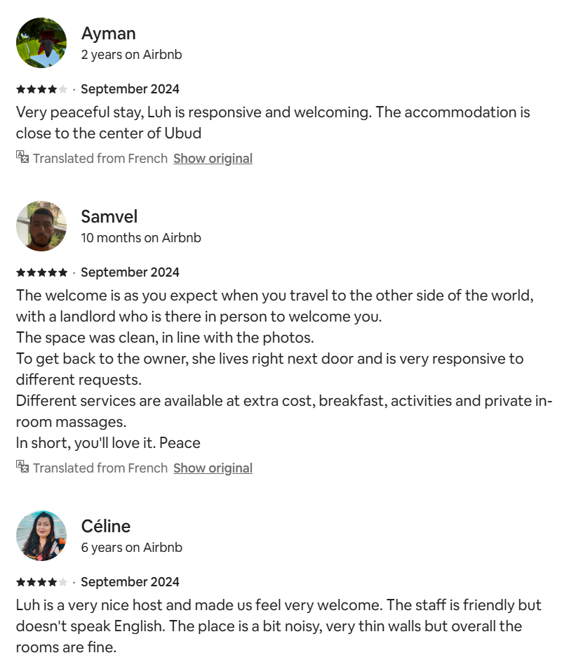 The villa is located in the local Balinese village and is surrounded by local households. Sometimes you can hear the sounds of the household animals that are nearby.