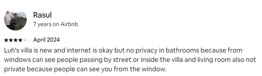 Take note that Bali is located in South-East Asia in the high humidity climate. As a result, if you visit Bali during the so-called Musim Hujan season (rain season) or just during the rainy weeks it may happen that after a few days with especially strong rains, in some places the walls may get wet (small spots). It may be visible inside the house. Also, be informed, that after that, at the surface of these wet spots in the aggressive tropical climate, the signs of mold may appear very fast - genuinely during a few hours. It can happen at any time, for example, on the night before your arrival and we are not always able to see such problematic places in time. Because of that, If you come and find wet or moldy places or bad-looking walls, inform us. To delete potentially unhealthy places on the walls, we will make an extra treatment as soon as possible (usually for a couple of hours). We will use a natural but effective way to delete the signs of mold and provide healthy conditions for your stay.