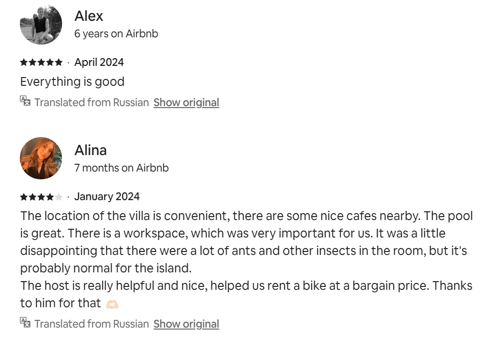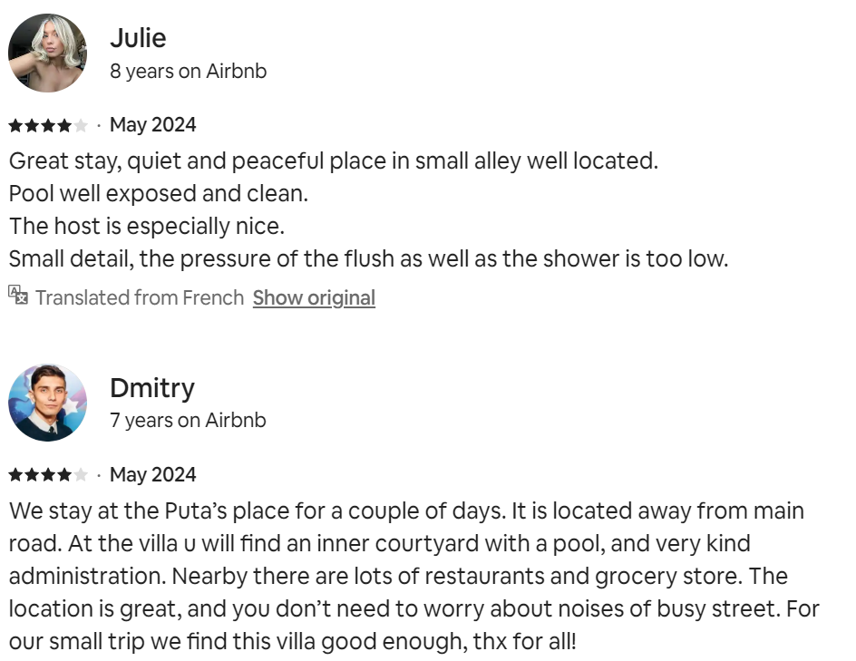 These are reviews that we copied from this property page. To read all the reviews go to the Airbnb page.