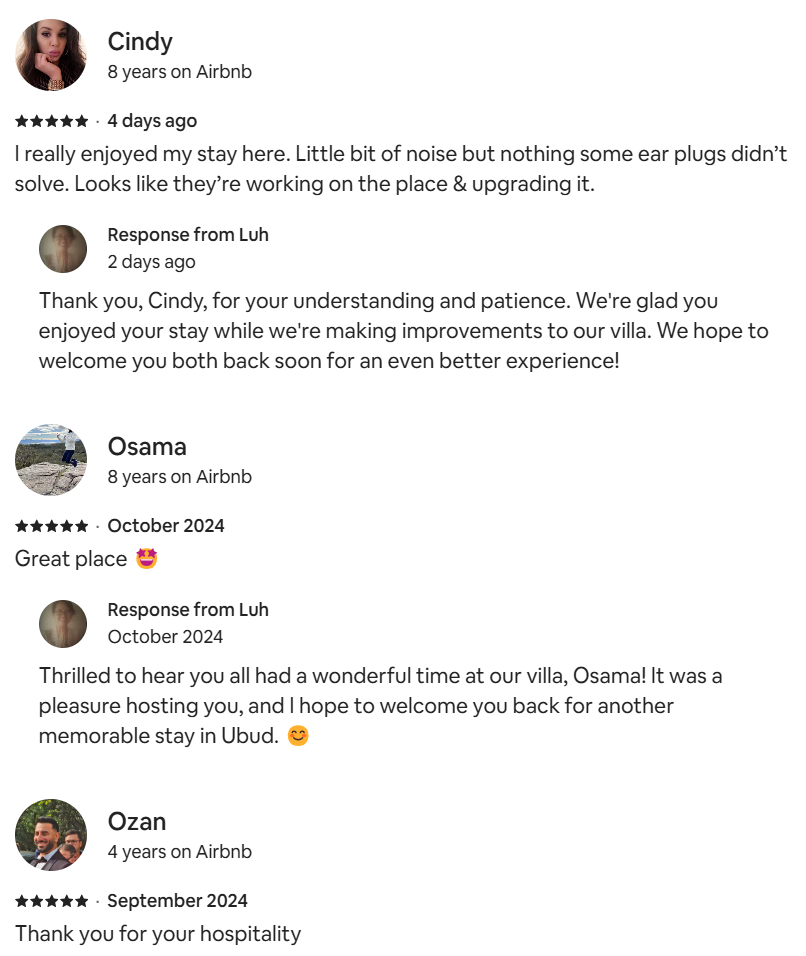 The villa is located in the local Balinese village and is surrounded by local households. Sometimes you can hear the sounds of the household animals that are nearby.