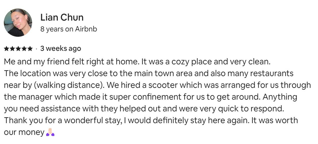 These are reviews that we copied from this property page. To read all the reviews go to the Airbnb page.