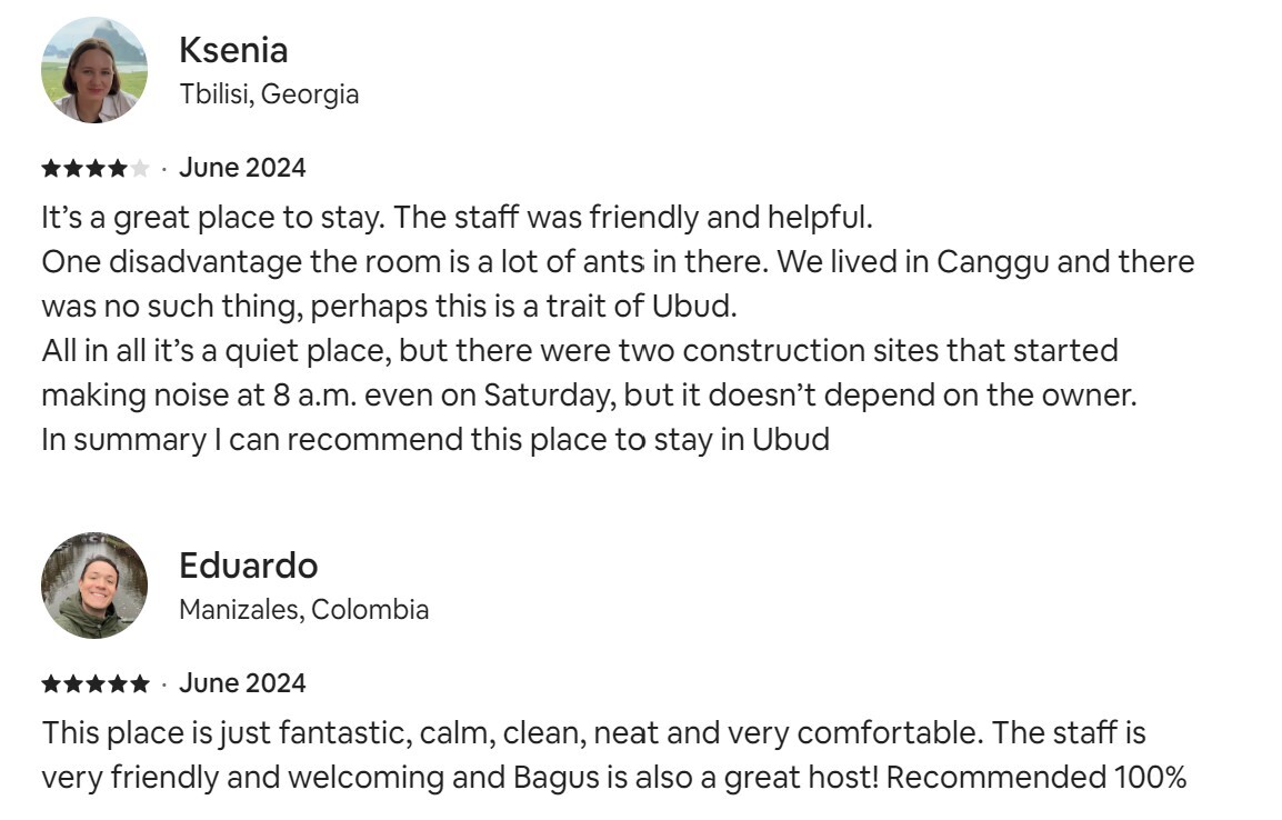 The big trees give some shadow; the water in the pool in luring; the neighborhood is quiet and amazed by its Balinese charm. There is a friendly and welcoming vibe here that you will feel from the first minute.